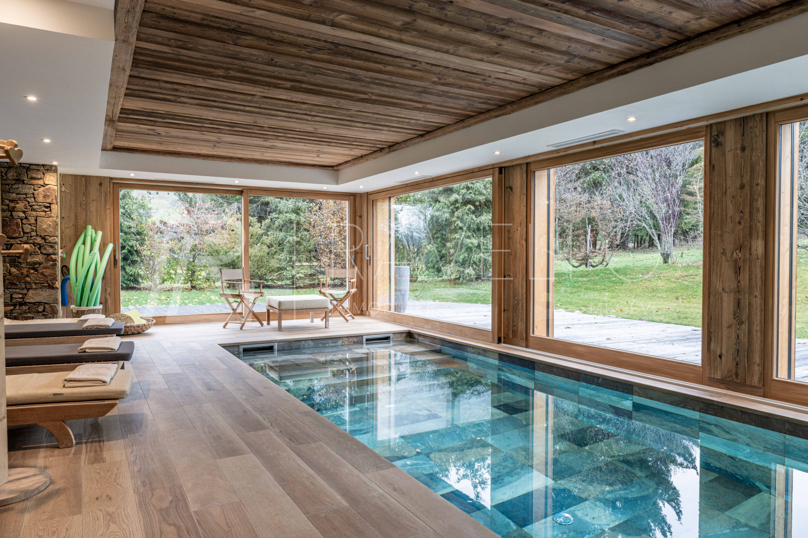 Espace bien-être : somptueux espace comprenant une piscine intérieure, un sauna, une douche rafraîchissante et un accès direct à une terrasse ensoleillée pour profiter pleinement de la vue sur les montagnes.