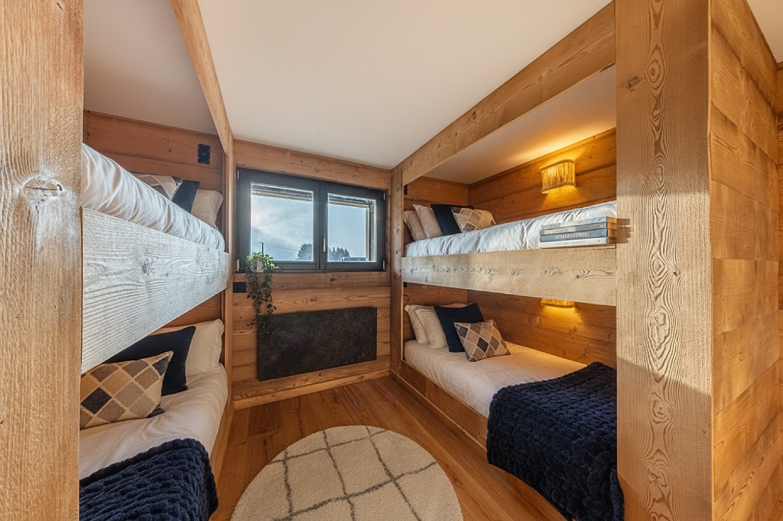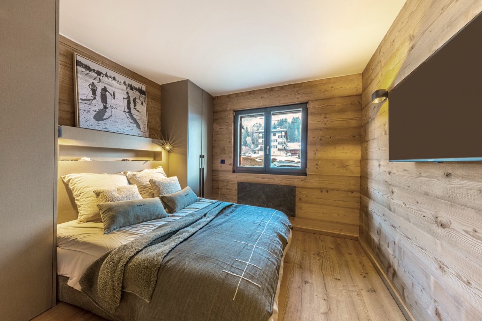 L’appartement propose un bel espace de vie comprenant un salon, une salle à manger et une cuisine ouverte. Il s’ouvre sur un grand balcon d’angle exposé Sud-Est et Sud-Ouest, offrant de superbes vues sur le massif de Rochebrune et le Mont Charvin. Trois chambres