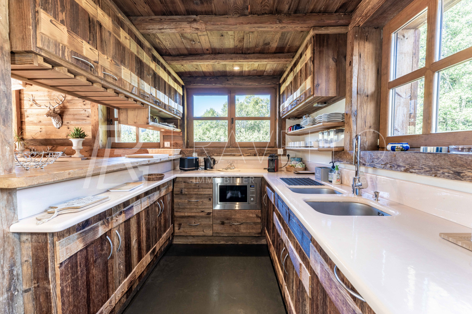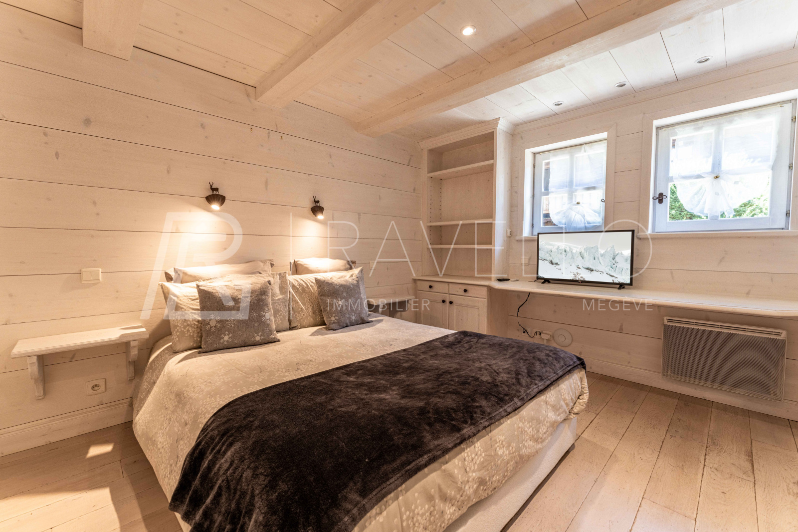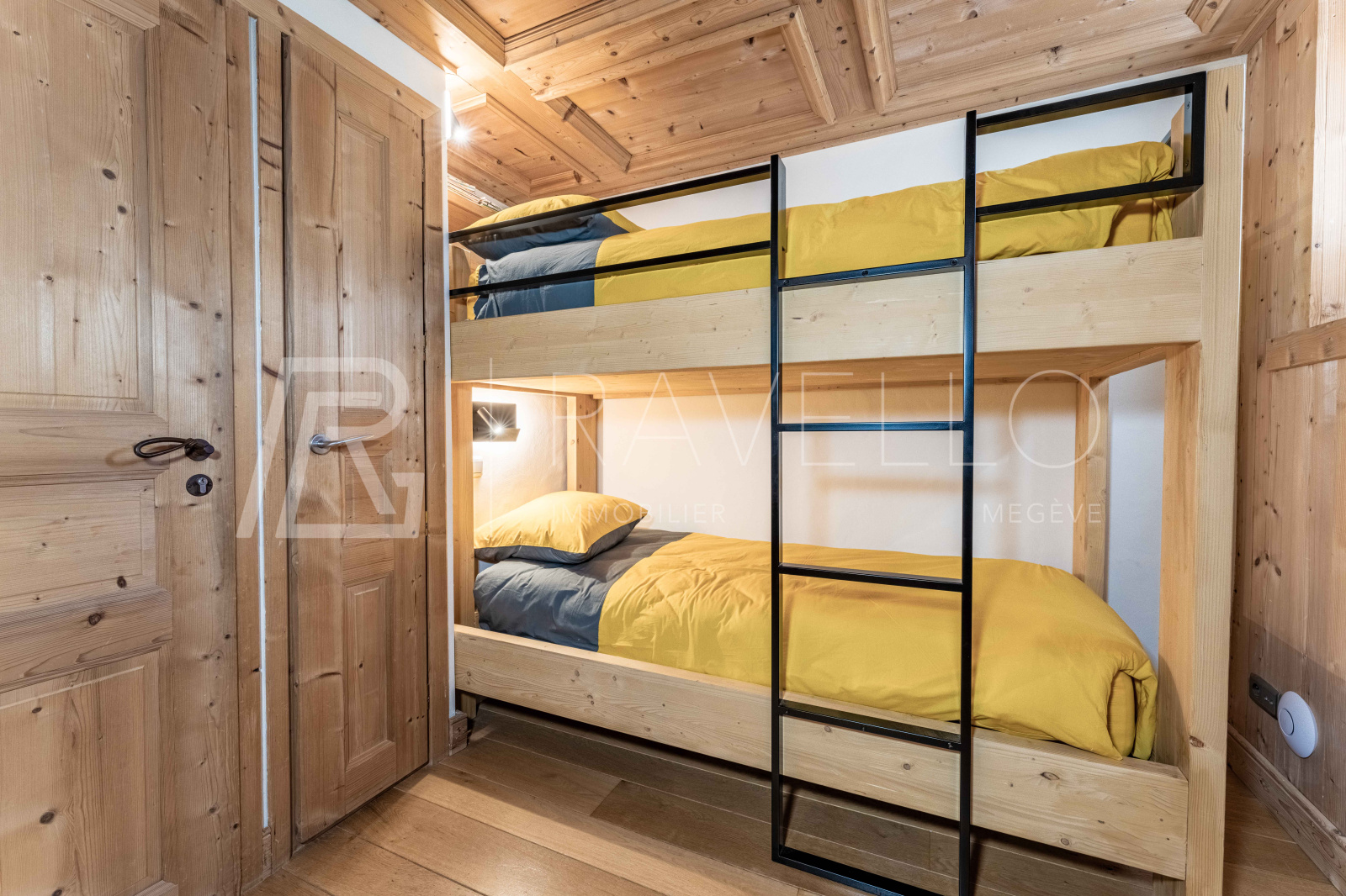 Ce chalet se distingue par la qualité de ses finitions intérieures, mettant en valeur le bois sous différentes essences et styles. Cette présence chaleureuse crée une atmosphère chic et raffinée tout en préservant le charme authentique d’un chalet de montagne traditionnel.